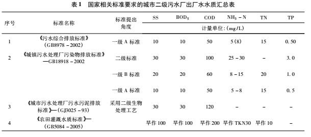 表1為國家相關標準對二級污水處理廠的出水水質要求,隨著“十二五”節能減排目標的推進,我國對城市污水處理廠出水水質的標準不斷提高,《城鎮污水處理廠污染物排放標準》規定,城鎮污水處理廠出水排入國家和省確定的重點流域及湖泊、水庫等封閉、半封閉水域時,執行一級A標準.基于傳統活性污泥法為主要處理工藝的早期投建的城市污水處理廠迫于政策和環境壓力,對污水處理廠進行提標改造勢在必行。