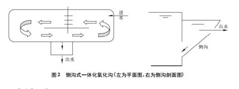氧化溝工藝作為活性污泥工藝的改型具有構筑物簡單、耐沖擊負荷強、處理效果和運行費用低等優點[15],在我國的應用廣泛,在我國南方城市應用較多.圖2為典型側溝式一體化氧化溝,該裝置混合液在流經側溝時一部分經過導流板均勻進入側溝,固液分離后,上清液通過出水口流走,下沉污泥在重力作用下經側溝自動下滑,回流至主溝,污水經過如此循環而得到凈化,并能取得較好的脫氮效果[16].從處理效果上講,氧化溝工藝的工程應用效果比較可觀.昆明市第一污水處理廠的運行效果表明,TN去除率可以達到70%,TP去除率近90%左右.對于新型氧化溝,如DE型氧化溝和三溝式氧化溝也有相關的工程應用實例,更適于中高污染物濃度的中小型城市污水處理,效果較好,如四川省新都污水處理廠,出水中TP濃度達到0.5mg/L以下.我國四川新都污水處理廠、山東梁山縣污水處理廠、北京大興縣黃村污水處理廠等目前都在運用此工藝.