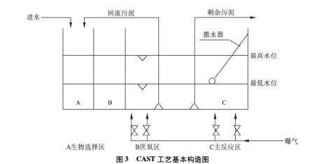 SBR工藝也稱為序批式間歇式反應器法[17]主要包括進水、曝氣、沉淀、排水、待機五個過程,限制曝氣進水與非限制曝氣進水是兩種基本的運行方式且該工藝不會發生污泥膨脹.根據運行方式改進后具有除磷脫氮功能的主要有ICEAS、DAT-IAT(曝氣池+反應池)工藝、CASS工藝等.國際上較多的中小型污水處理廠常采用CAST工藝,循環曝氣活性污泥法CAST是SBR工藝的變型工藝,屬于間歇式活性污泥法.與傳統SBR相比,CAST池在主反應池前端設置生物反應器用于污泥回流,污泥回流泵將主反應區的活性污泥回流到生物選擇器中,圖3為CAST工藝構造圖.生物選擇器中溶解氧濃度低于0.5mg/L,選擇器呈缺氧-厭氧環境狀態.SBR工藝及其改良工藝在我國浙江遵義市污水處理廠、河南山陽縣污水處理廠、江西宜賓市南岸污水處理廠及四川五通橋區污水處理廠(二期)等均有應用.