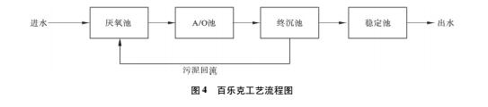 懸鏈式活性污泥工藝也被稱作百樂克工藝(BLOLAK),該工藝作為活性污泥處理特色系統,已經在國內外有了廣泛的應用,積累了豐富的實踐經驗,技術成熟,不僅可以達到去除有機物的目的,也能滿足污水對氮磷指標的排放要求,圖4為百樂克工藝流程.懸鏈式活性污泥工藝的反應池型比較靈活,可以根據地形,采用投資低廉、池易于開挖的土地結構,鋪設HDPE防滲透膜以保護地下水與污水的隔絕.但該工藝降低了土地利用率,適用于工廠企業的生產廢水處理,投資少,效率高.九臺市污水處理廠(1.0×104m3/d),2009年投入使用,污泥負荷過低,反應停留時間長達20h,經過控制參數調整,運行效果良好,可以達標。