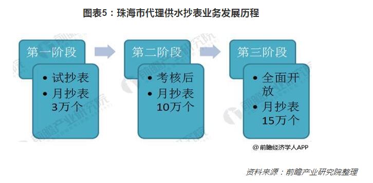 代理供水抄表業務是由珠海局負責上門抄錄水表用水量讀數、張貼催繳費單、巡視供水設備和配合供水知識宣傳等工作。珠海局代理供水抄表工作分三階段開展:2011年11-12月開始試抄表,每月須抄核水表數量約3萬個;達到珠海水務集團考核標準后,實施第二階段,即從2012年1月1日-6月30日,每月須抄核水表數量約10萬個;再達到對方考核標準后,全面開放市區抄核水表用戶,每月須抄核水表約15萬個。該項目的合作,促進了供水賬單業務的深度發展,降低了供水賬單業務的流失風險,也增加了水務企業的盈利空間。