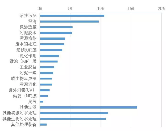從全球水技術裝備銷售來看,污水處理的預處理、活性污泥法、MBR、澄清、消毒技術裝備;污水深度處理的微濾、超濾、反滲透技術裝備;污泥處理處置的脫水、濃縮、干燥及消化技術裝備;工業廢水脫鹽技術裝備等成為目前全球水處理技術市場銷售的主要裝備。其中,包括微濾、超濾、納濾、反滲透在內的過濾設備成為全球水技術最主要的設備,占比達29.3%,其次為活性污泥法技術設備、澄清技術裝備、污泥脫水與濃縮裝備,占比分別達10.6%、9.7%、9.4%(圖2)。