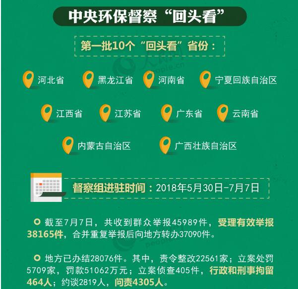 經黨中央、國務院批準,第一批中央環境保護督察“回頭看”6個督察組于2018年5月30日至6月7日陸續對河北、內蒙古、黑龍江、江蘇、江西、河南、廣東、廣西、云南、寧夏等10省(區)實施督察進駐。截至7月7日,全部完成督察進駐工作。截至7月7日,共收到群眾舉報45989件,經梳理分析,受理有效舉報38165件,合并重復舉報后向地方轉辦37090件。各督察組深入基層調查核實,堅決查處督察發現的“表面整改”“假裝整改”“敷衍整改”等問題,對典型案例進行公開點名批評。哪些城市、企業被點了名?