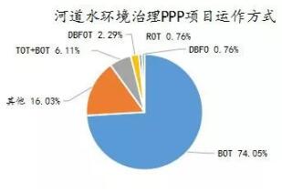 131個河道水環境治理PPP項目,有97個項目運作方式集中于BOT方式,占比高達74.05%。現有的河道水環境治理PPP項目以新建項目居多,截污處理以及生態修復等建設工程為主,因此,更多采用BOT運作方式。