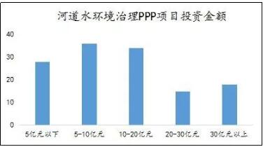 從上圖可知,河道水環境治理類PPP項目投入金額偏大,5億元至20億元項目占比最多,甚至還存有30億元以上項目。傳統的河道水環境治理采取單一治理模式,項目投資規模小;而目前綜合治理模式更多采取整體打包治理模式,建設子工程多,采購任務重,項目投資資金需求加大。