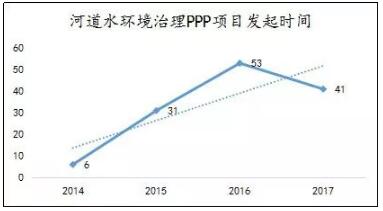 河道水環境治理PPP項目數量從2014年到2017年整體趨勢是上升的,如趨勢線所示(虛線),但2016年至2017年出現降低。總的來說,河道水環境治理PPP項目還是處于一個較快的發展水平。