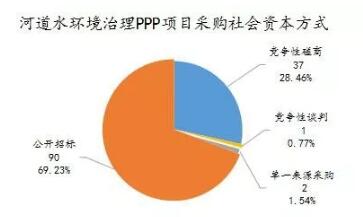 從上圖可知,河道水環境治理PPP項目的采購社會資本方式以公開招標為主,項目數達到90個,其次是競爭性磋商方式,有37個,兩類采購方式占比高達96.95%,競爭性談判與單一來源采購項目分別只有1個和2個。實際上,河道水環境治理項目通常具有內容復雜、邊界不清晰的特點,競爭性磋商更適合。